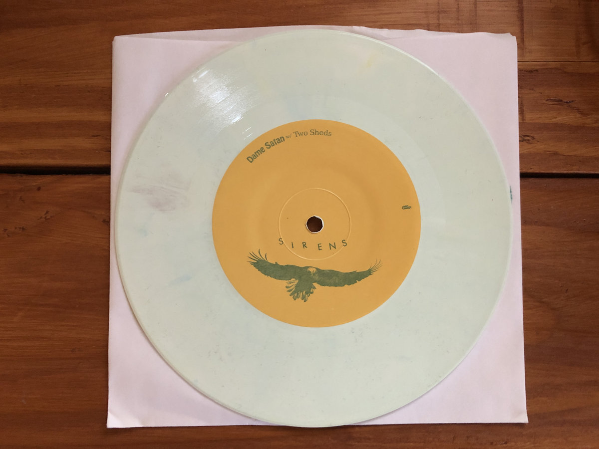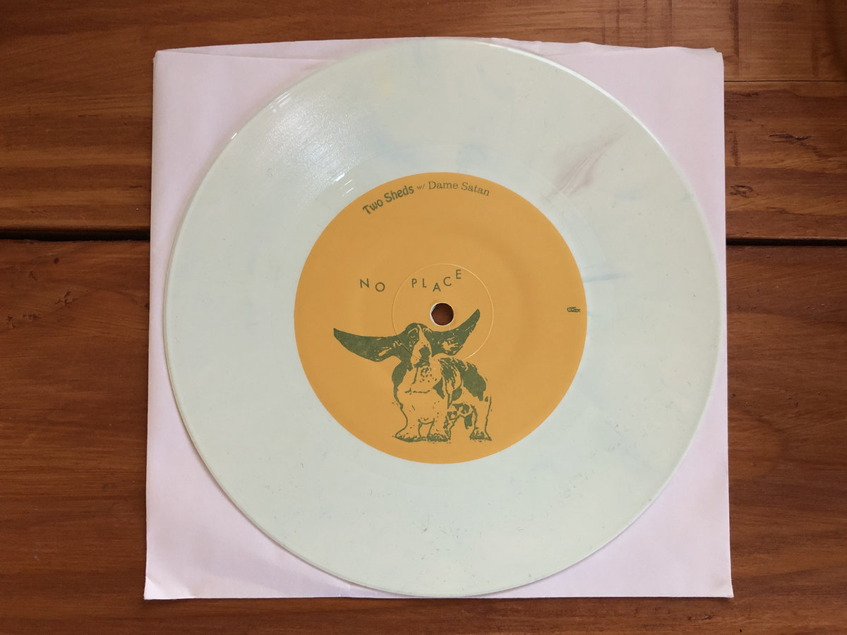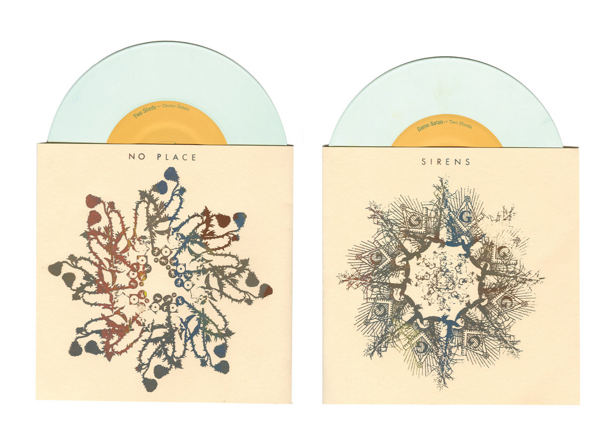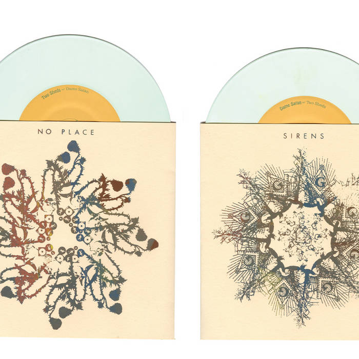 Two songs pressed on minty green vinyl. Originally released in 2007 on Ghost Mansion records - "No Place" by Two Sheds - performed by Two Sheds and Dame Satan and "Sirens" by Dames Satan - performed by Dame Satan and Two Sheds. Recorded by Robert Cheek at the Hangar in Sacramento Ca.